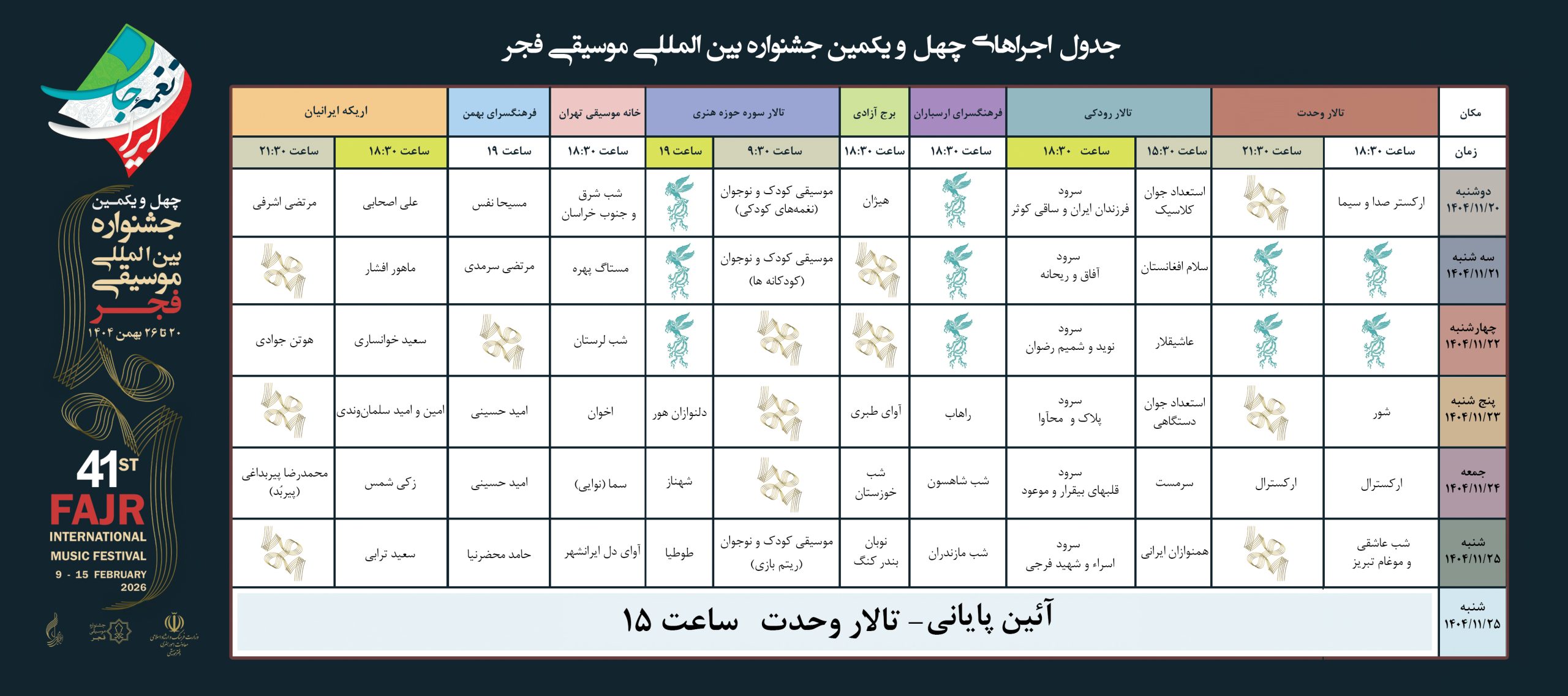 جدول اجراهای چهل و یکمین جشنواره بین المللی موسیقی فجر