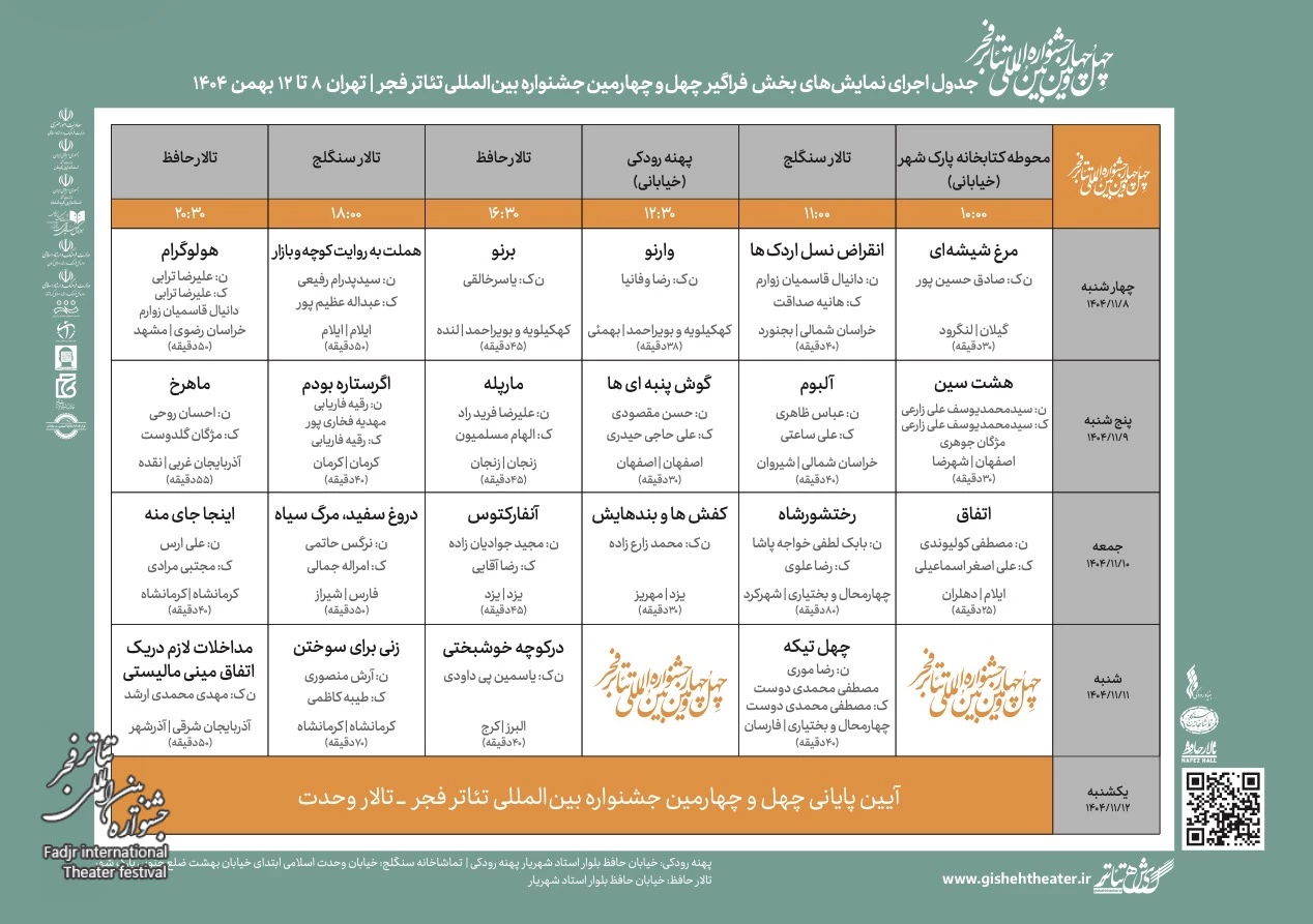 به گزارش میزهنری،به نقل از روابط عمومی ادارهکل هنرهای نمایشی، جدول نمایشهای حاضر در بخش «فراگیر» چهلوچهارمین جشنواره بینالمللی تئاتر فجر منتشر شد.