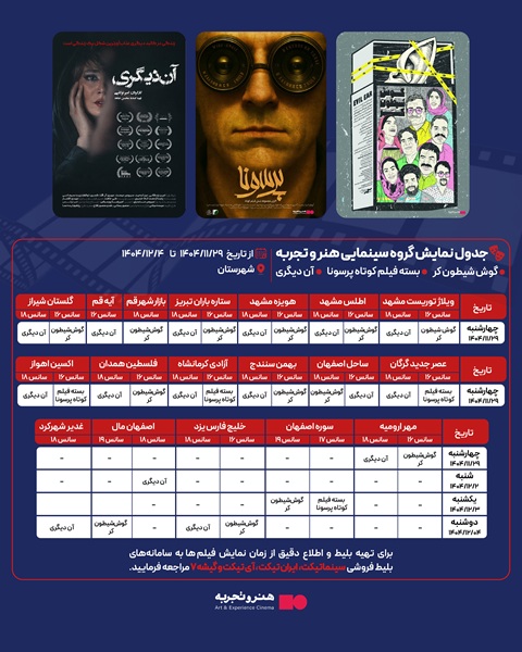 به گزارش میزهنری،به نقل از روابط‌عمومی گروه سینمایی هنرو تجربه،جدول نمایش فیلم‌های “گوش شیطون، کر”، “آن دیگری” و “بسته فیلم کوتاه پرسونا” در سینماهای منتخب هنر و تجربه در شهرستان‌ها منتشر شد. علاقه‌مندان می‌توانند برنامه نمایش این آثار را در سینماهای محل زندگی خود مشاهده و بلیت تهیه کنند.