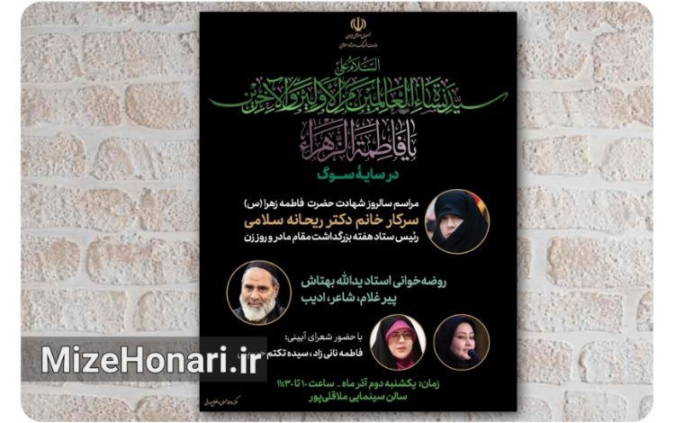 ویژه برنامه “در سایه سوگ” فردا دوم آذر همزمان با شب شهادت حضرت فاطمه (س) با حضور سیدعباس صالحی وزیر فرهنگ و ارشاد اسلامی، در سالن سینمایی ملاقلیپور وزارت فرهنگ و ارشاد اسلامی برگزار میشود.