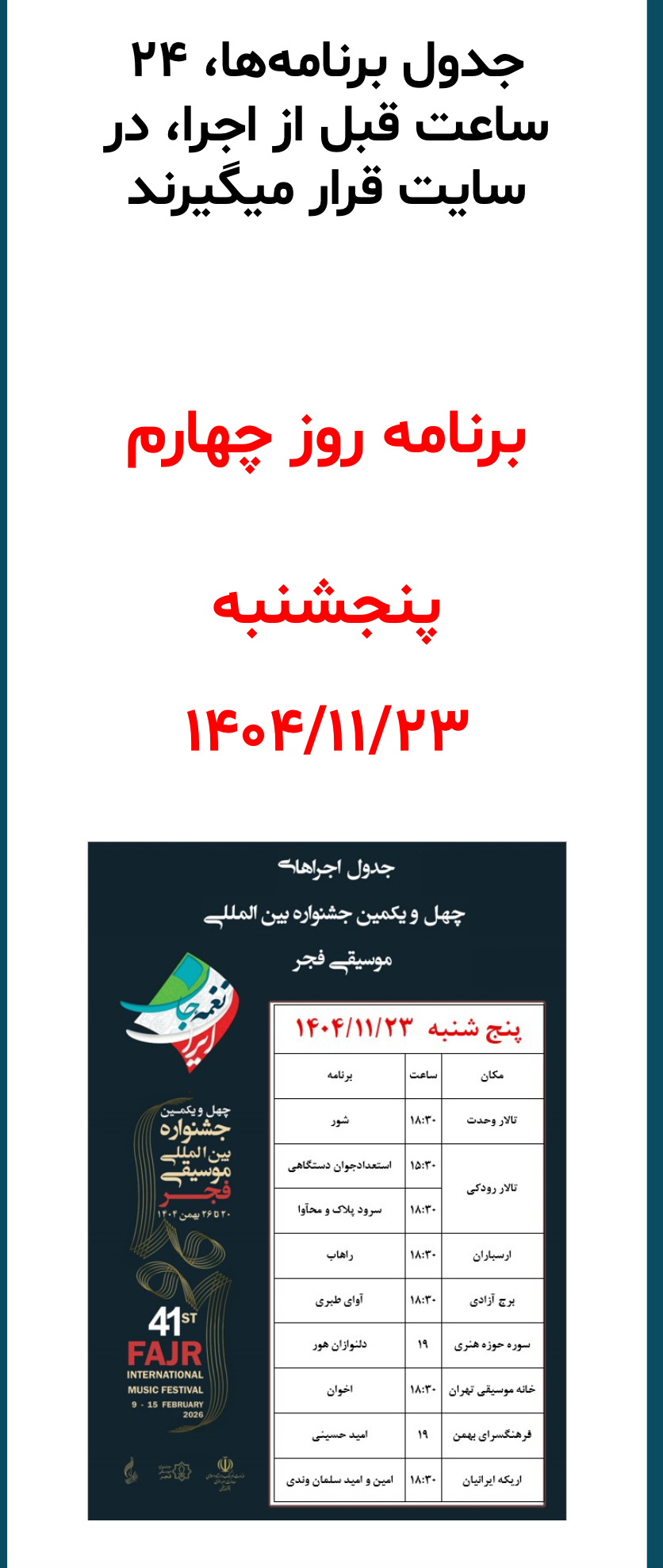 به گزارش میزهنری،به نقل از روابط عمومی چهل و یکمین جشنواره بین‌المللی موسیقی فجر، چهارمین روز این جشنواره امروز ۲۳ بهمن ۱۴۰۴ با اجرای ۹ گروه در تالار وحدت، تالار رودکی، خانه موسیقی تهران و اریکه ایرانیان برگزار می شود.