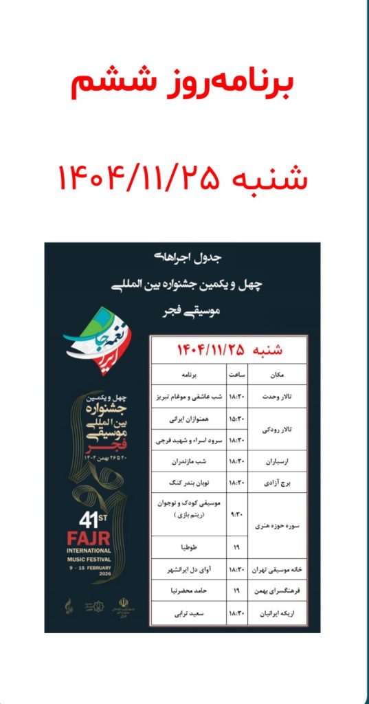به گزارش میزهنری،به نقل از روابط عمومی چهل و یکمین جشنواره بین‌المللی موسیقی فجر، پنجمین روز این جشنواره امروز ۲۴ بهمن ۱۴۰۴ با اجرای ۱۱ گروه در تالار وحدت، تالار رودکی، خانه موسیقی تهران و اریکه ایرانیان برگزار می شود.