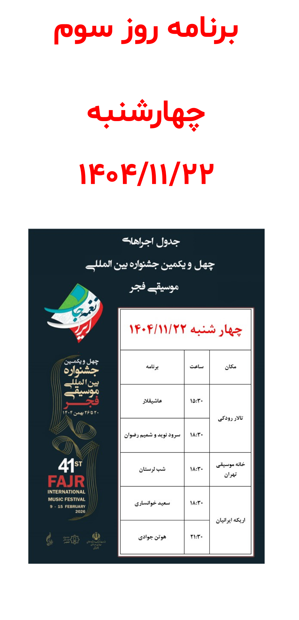 به گزارش میزهنری،به نقل از روابط عمومی چهل و یکمین جشنواره بین المللی موسیقی فجر، سومین روز از چهل و یکمین جشنواره موسیقی فجر امروز با ۵ اجرا در تالار رودکی، خانه موسیقی تهران و اریکه ایرانیان برگزار می شود.