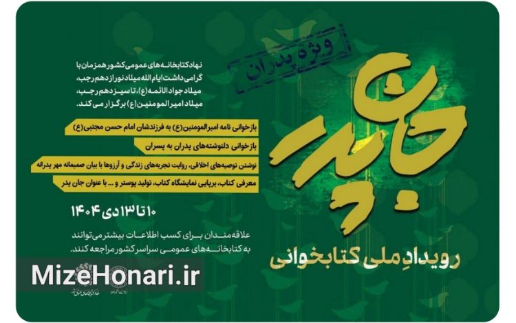 همزمان با ایام‌الله ولادت حضرت علی (ع) و با همکاری نهاد کتابخانه‌های عمومی کشور و بنیاد بین‌المللی غدیر، رویداد ملی کتابخوانی «جانِ پدر» ویژه پدران از ۱۰ تا ۱۳ دی‌ماه ۱۴۰۴ برگزار می‌شود.