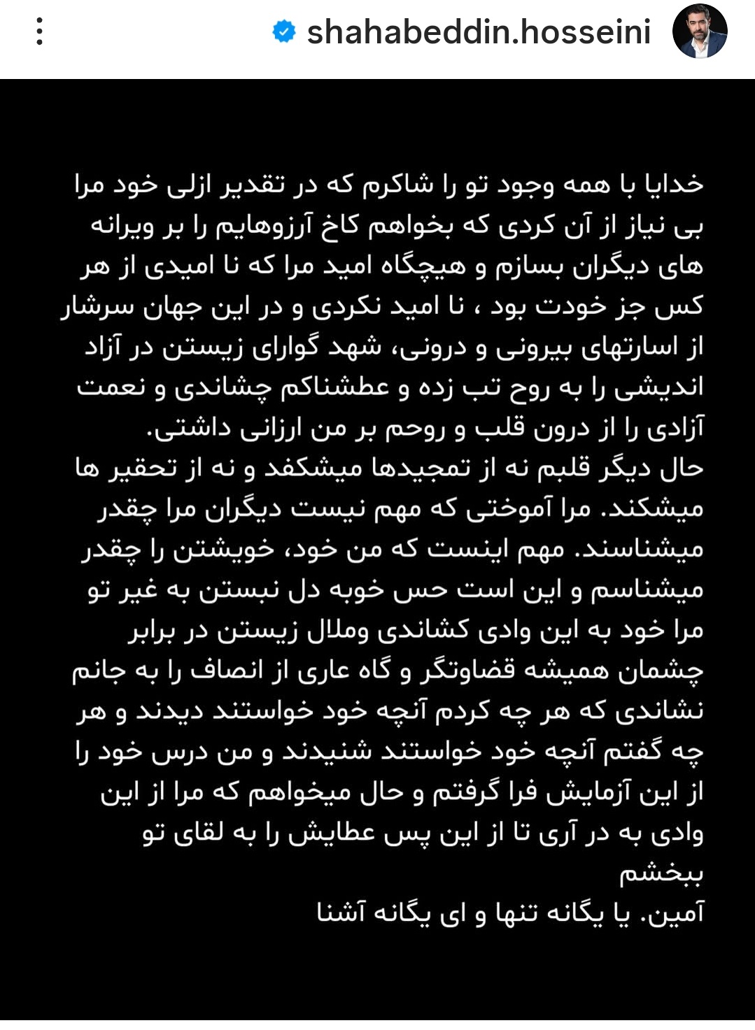به گزارش میزهنری، شهاب حسینی با انتشار پستی در صفحه شخصی خود، از خداحافظیاش با بازیگری خبر داد.